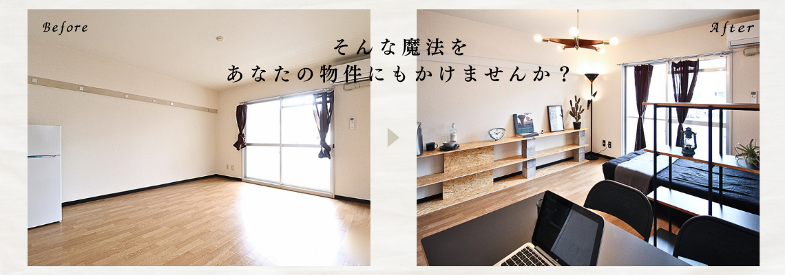 2DKの空室アパートへのホームステージング。他のお部屋で大家様がご自分で家具を買ってステージングされていたものを利用しつつ、家具と小物を追加し、よりワクワクする生活をイメージでき、魅せるお部屋へ変身させました。