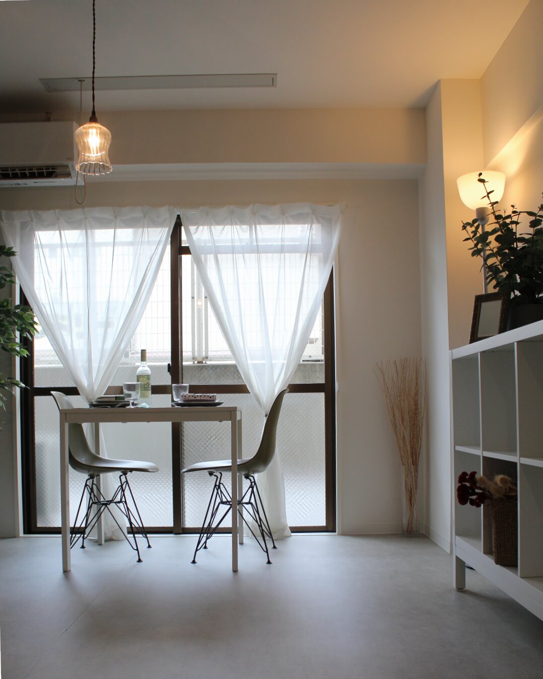 築40年のアパート。家具は管理会社様が入れてくださっていたのを利用し、レイアウト変更と小物で飾り付けをしました。窓の外の緑が素敵なので、カーテンを開け、お部屋の魅力を演出。